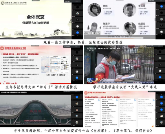 在学习交流环节,党员们集中学习了奋战在抗疫一线的工作人员爱岗敬业、担当作为、攻坚克难的事迹,尤其是身边的榜样、北航员工余汉明同学参与一线志愿服务的先进事迹。之后,王彬宇同志讲述了自己参加防疫志愿的故事,当社区面临疫情,他主动加入防疫一线,担任社区老员工志愿队临时团支部书记。他上下沟通,凝聚力量,很快将老员工志愿队凝聚成了一支防疫先锋队。他们被小区居民亲切地称为防疫知识的宣传员,保障安全的消防员,配送物资的快递员。紧张充实的防疫经历使王彬宇更加懂得了青春的责任与担当;韩泽旭同志也分享了他主动加入当地文联组织的文艺志愿者活动的故事,一方面,韩泽旭协助当地文艺工作者张贴宣传标语、讲解防护小知识、测量体温、进行抗击疫情文艺宣传以及进行抗疫文艺作品的信息统计工作;另一方面,韩泽旭还主动创作了抗疫宣传快板两个、朗诵诗一首,他的作品被当地文联采用,在群众中广泛宣传,深受好评;牛迟同志分享了他作词《草长莺飞,我们再会》的心得,突如袭来的疫情打破了这个春天的安宁,病毒非常凶猛,但我们却从未退缩,顽强地斗争拼搏,谨以重新填词的歌曲致敬所有在防疫中奉献的人们,待到草长莺飞,我们终将再会(原歌曲:梦想天空分外蓝,陈奕迅);正在海外学习的陈诚同志分享了自己对比国内外抗疫局面后对党的坚强领导和国家制度优势的深切体会,疫情之下党和国家的强大领导力和卓越的制度优势,以及民族凝聚力使中国取得了抗疫的显著成效;胡廷辉同志为大家讲述了“汶川籍女护士佘沙两次请战赴鄂”的感人故事。