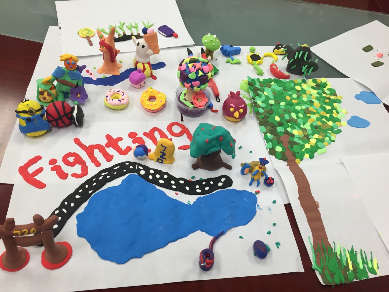 活动接近尾声,但是每个作品和成员的发言仍历历在目。例如:以许少鹏同志为代表的队伍用粘土绘制了一幅完美的自然景观图,图中有红色的大写英文单词“Fighting”,象征着我们720-2党支部积极乐观的精神,图中有茂密的大树、扁长的石子路、蔚蓝的湖泊,灵动的小蛇,辛劳的农夫,还有标着“720”的大门,象征着党支部的大门永远向大家敞开,所有的这些都构成了一幅美丽的、完整的画面,象征着720是一个温馨、团结、乐观、向上的大家庭。以郭鸿杰同志为代表的队伍用黄色、翠绿色、深绿色的粘土拼凑出了茂密的参天大树,星星点点的叶子象征着支部成员,在平日里各自忙碌的大家为了同一个目标,或者在同一个大家庭中凝聚在一起,共同组成了无所畏惧的大数,美丽的构图将这样的含义完美的展现。以韩宁同志为代表的队伍用蓝色的圆球代表健康、无污染的地球母亲,用各色各样的爱心、星星点缀在球上,然后在底座上铺满绿色象征草地,再在草地上点缀一直美丽的玫瑰花,最后完成了一颗立体的形似大树的作品,它的创作灵感来源于保护地球、保护自然资源、保护花草树木的环保意识,号召大家热爱环境,怀抱自然。