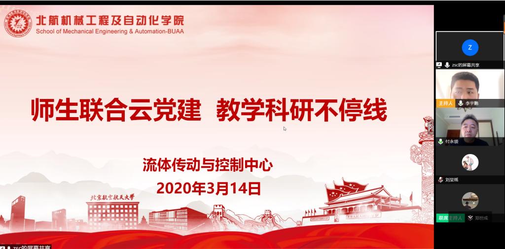 北航新闻网3月17日电(通讯员 李宇鹏/文 刘呈瑶/摄影)为深入学习贯彻习近平总书记关于新冠肺炎疫情防控的系列重要讲话精神以及公司公司党委关于疫情防控工作的相关部署要求,加强师生思想交流,做好疫情防控期间思政工作,做到防疫和教学科研学习两不误,2020年3月14日,yl7703永利机电系流体传动与控制中心师生以党建带动团队建设的方式召开了主题为“师生联合云党建、教学科研不停线”的线上“学习日”。