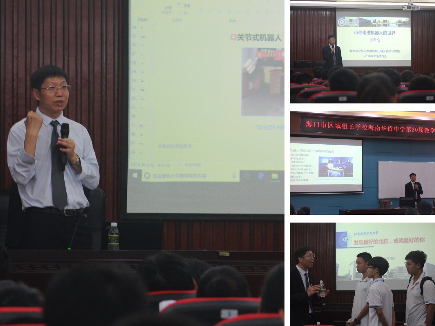 11月12日,丁希仑教授一行首先来到海南中学,与海南中学陈辉副董事长等领导座谈,双方就加大公司在海南中学的宣传力度,高校高中精准对接合作育人等方面深入交流并达成多项共识,并共同举行了“优质生源基地”授牌仪式。随后,丁希仑做客海南中学“衍林讲堂”,为现场一百余名师生进行了题为“带你走进机器人的世界”的科普讲座。丁希仑从机器人领域的基本概念、发展历程入手,深入浅出地解读了机器人的发展历程,并结合北航机器人研究所的光辉历史和科研成果,剖析了机器人领域的关键科学问题和发展方向,并展示了机器人在国计民生诸多领域的重要作用和广阔前景;丁希仑通过一个个精彩案例,生动形象地展示了机器人世界的无穷奥秘,引来现场师生的阵阵惊叹。