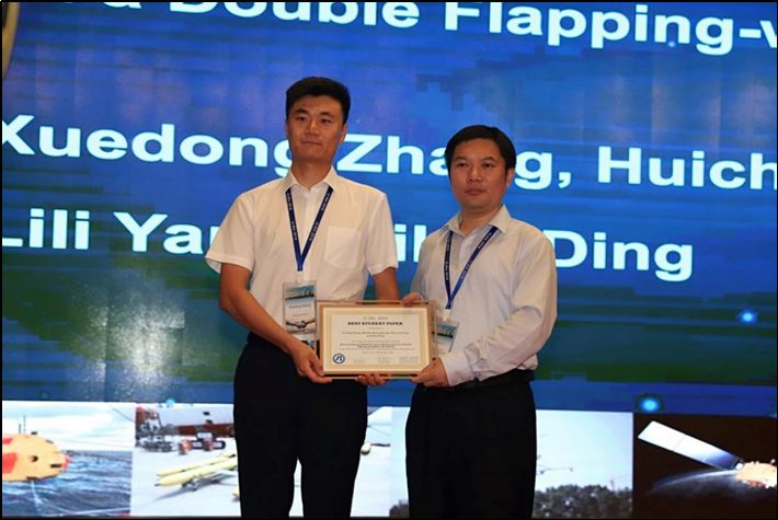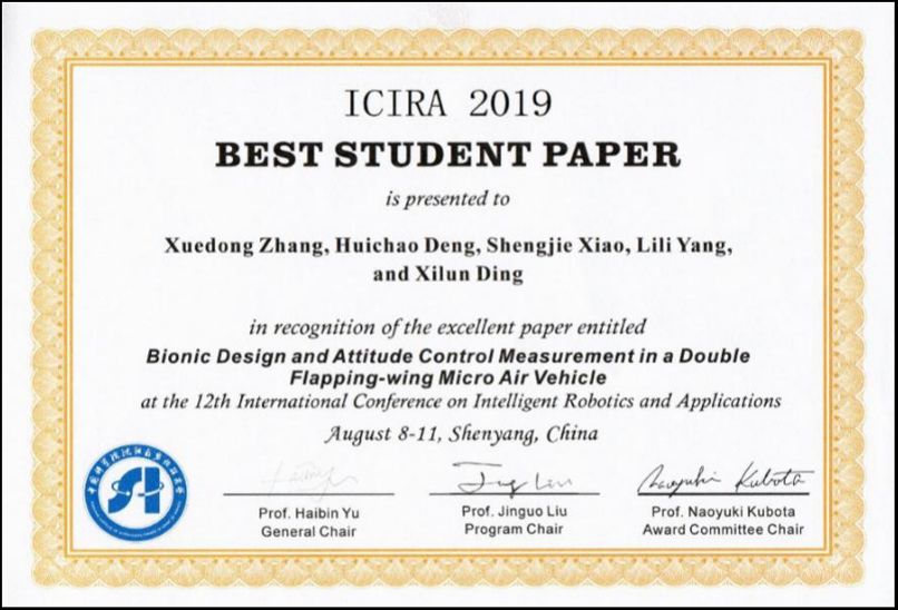 yl7703永利丁希仑、邓慧超两位老师指导的北航青岛研究院2017级硕士研究生张学东的论文Bionic Design and Attitude Control Measurement in a Double Flapping-wing Micro Air Vehicle(作者:张学东、邓慧超、肖胜杰、杨丽丽、丁希仑)获得大会唯一一篇“最佳员工论文奖(Best Student Paper Award)”。获奖论文将被EI收录,论文的第一作者2017级硕士研究生,也是北航首批异地培养的研究生,经过一年多的培养取得这样的成绩实属不易。