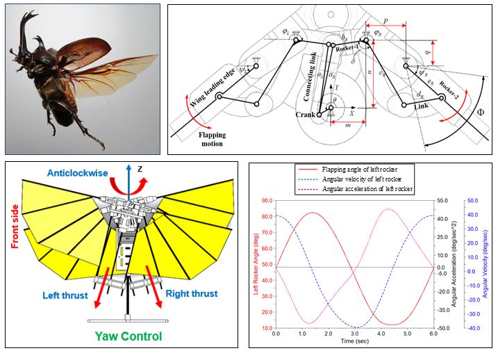该论文基于仿生学原理,以昆虫独角仙为仿生对象,利用昆虫飞行时产生高升力的Weis-Fogh机制,对飞行器翅膀翼型、扑动机构以及姿态控制机构进行了仿生设计,最终研制出一款可实现定点悬停及各姿态解耦控制的微型仿生扑翼飞行器原理样机。与现有技术水平相比,该飞行器拥有更高的升重比,各飞行姿态控制机构均实现了解耦设计,飞行器拥有更高的机动性和灵活性;与其它微型飞行器相比,该飞行器在复杂狭小未知环境中拥有更优越的飞行性能,在未来反恐侦察、灾害救援、情报获取等领域具有广阔的应用前景。该项目获得了国家自然科学基金委员会“微型扑翼机器人仿生优化设计与控制研究(基金编号:74023001)”的资助。