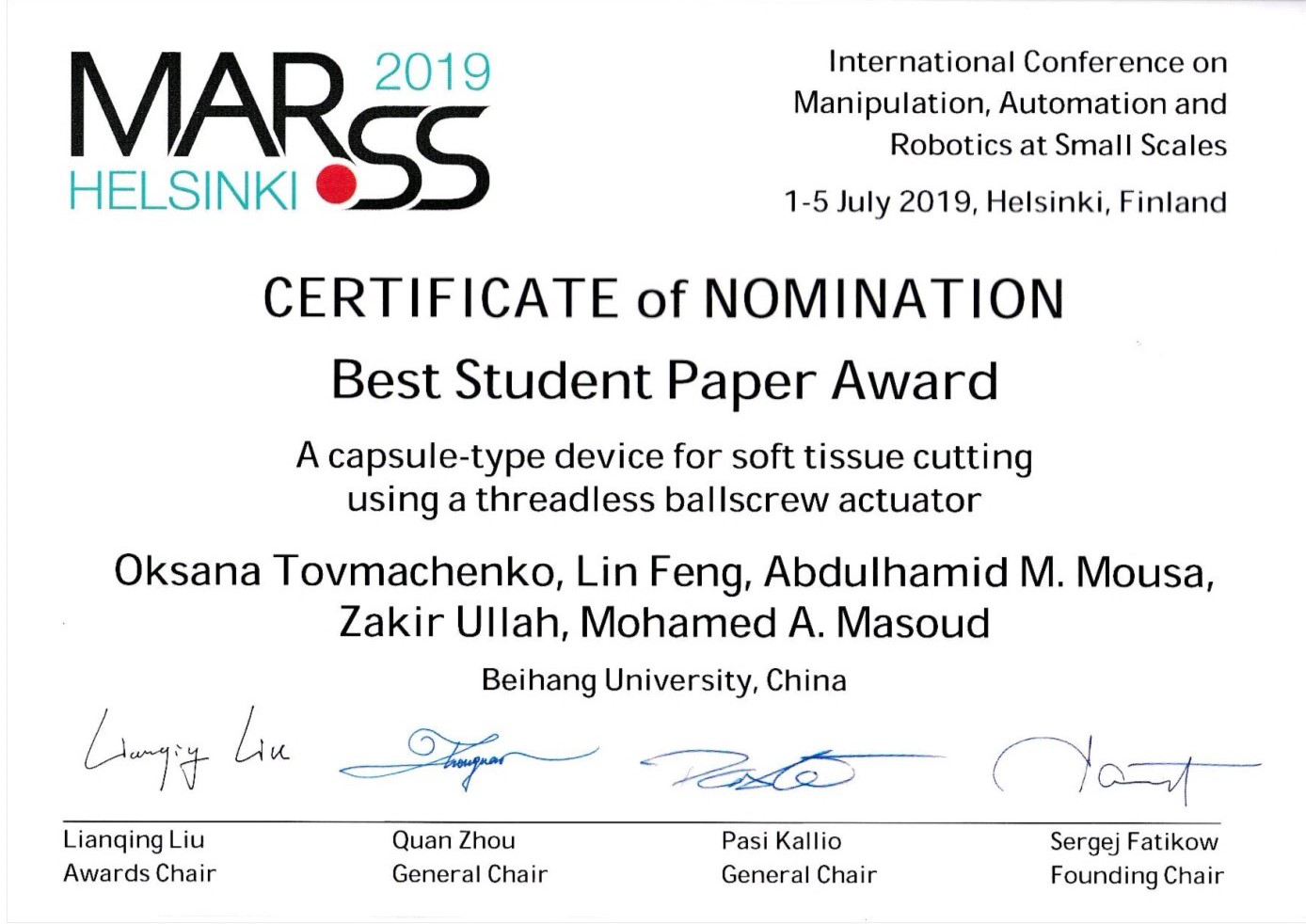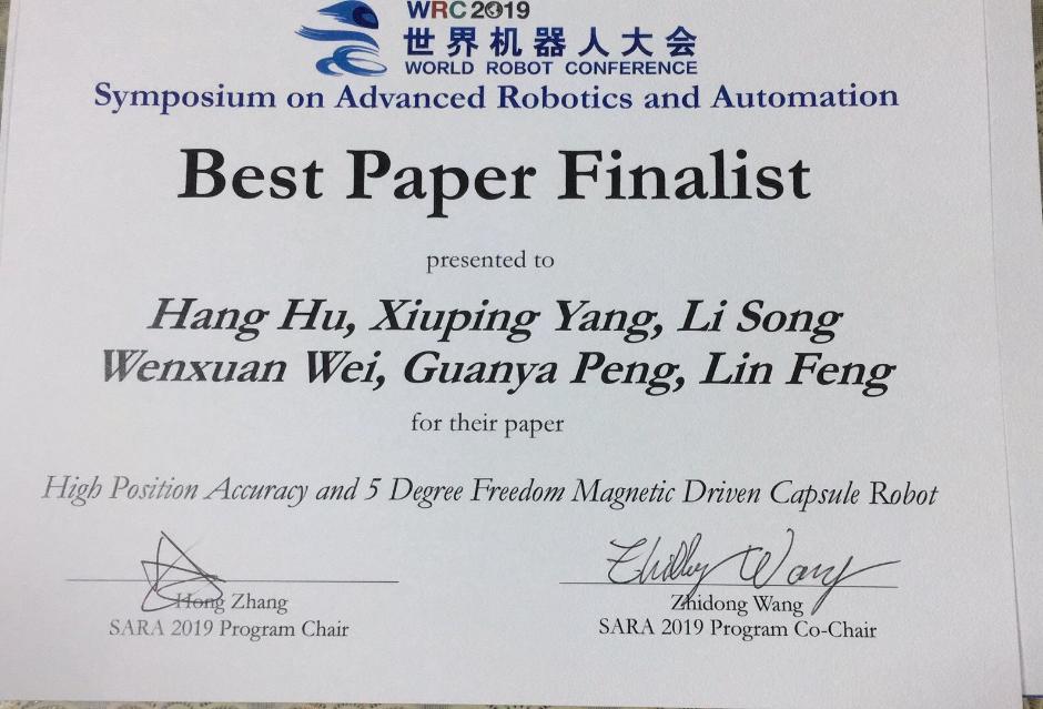 本次大会中,北航yl7703永利冯林老师团队本科生扈航、杨修平、宋理等人关于胶囊机器人高精度高自由度驱动系统的研究“High Position Accuracy and 5 Degree Freedom Magnetic Driven CapsuleRobot”获得最佳论文提名奖(Best Paper Finalist)。该无线胶囊可实现无线驱动、高精度移动、高精度环扫等功能。无线胶囊机器人已取代传统的胃镜系统成为医学检查领域的研究热点,胶囊机器人便于携带、减轻病人痛苦、并且完全具备取样、拍摄图像、定向导航等功能,具有广泛的应用前景。