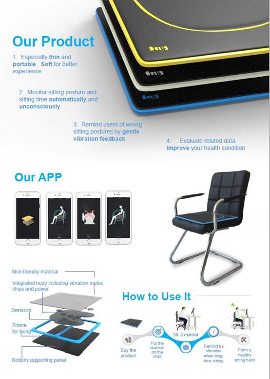 现今的大城市中,人们由于久坐或者不良坐姿受到了许多健康问题的困扰。Footprinter团队研发了一款可以监测用户坐姿并及时进行干预的智能坐垫。该智能坐垫通过内置的八个薄膜压力传感器来采集用户的坐时、坐姿等信息,在用户久坐或者长期处于不良坐姿时,其会通过内置的振动马达模块来进行相应的提醒与纠正。此外,该智能坐垫还配备有手机端的APP。用户可以通过APP实时获得自己的坐姿信息,并且对坐垫的相关参数、提醒频率等进行设置。