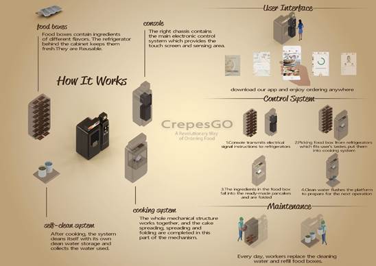 当你徘徊在办公楼里,吃腻了门口每一家路边餐馆;当你加班饿到饥肠辘辘,能买到的热食只有售货机里的咖啡;当你妄图走遍大街小巷,找不到一家卫生健康的煎饼果子。如果饮料可以从自动贩卖机买,零食可以,咖啡可以,那煎饼也可以!FOODIE-Tec团队设计的煎饼自动贩卖机,有着优雅的造型,巧妙清晰可观赏的制作工艺,用户定制的口味和加料,使用感友好的下单程序。突破传统自动售货机的概念约束,让煎饼从路边摊变成咖啡一样触手可及。