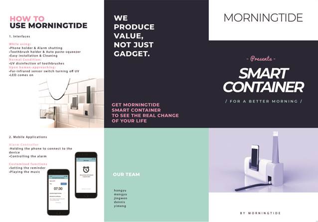由Morningtide团队设计搭建的晨间效率提升站,是一款多功能IoT智能收纳盒,为有效唤醒上班族与员工党,协助收纳整理浴室提供了物联网解决方案,助力奋斗者以清新的早晨高效地开始新的一天。晨间效率提升站由手机APP智控,集感应闹钟与自动牙膏、洗漱用具与手机收纳、红外感应与紫外消毒于一身,满足青年奋斗者健康、高效、智控的需求。团队完成了一件商业前景广阔的敏捷产品设计与制造,也在过程中提升了综合管理、商业、设计、制造的综合实践能力。