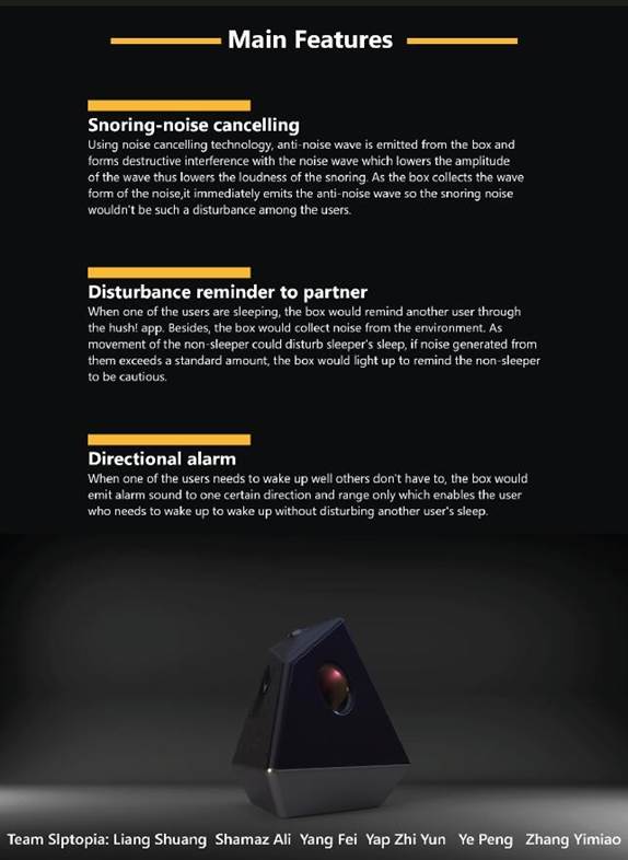 Slptopia团队从老员工宿舍生活的睡眠干扰现象的痛点出发,针对高密度人口城市中共享睡眠空间的人群(例如:住宿员工、换班职工)设计了一款名为Hush Box的智能情感化交互装置,旨在解决因不同作息时间、走动、声音而造成的睡眠干扰问题。产品以多面体呼吸灯的形式呈现,在不同面体上分布不同功能触发装置。主要功能为:主动降噪控制、通过APP及灯光变化提醒噪音来源方、睡眠检测和白噪音唤醒。在最终样机中,通过借助ANC等相关技术,产品可以在有限范围内实现噪音减小效果。