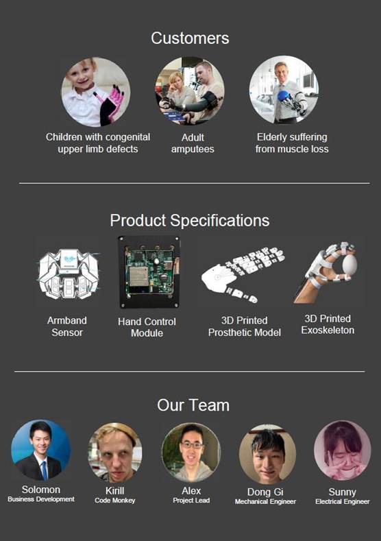手部缺失的残疾儿童随着年龄的成长,需要经常更换手部假肢以适应身体的变化,然而此类假肢一般售价昂贵,维护困难。Sparthan团队利用自身的机器人开发优势,针对残疾儿童的需求,开发了一款开源的低成本模块化假肢产品。产品由臂环传感器、易操作的核心控制模块、3D打印的手部关节和外骨骼组成,伴随着残疾儿童的成长,他们只需定制和更换组件中成本相对最低的3D打印的手部关节,即可满足自己新的需求。同时这款产品也为假肢的研发人员提供了一个开源的、友好的、可用性更高的测试及实验材料。
