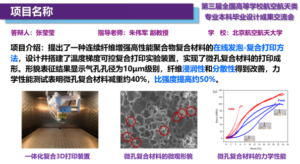 张莹莹同学的毕设成果《连续纤维增强微孔复合材料的原位发泡3D打印实验研究》(指导教师:朱伟军副教授)荣获飞行器制造工程专业组二等奖。