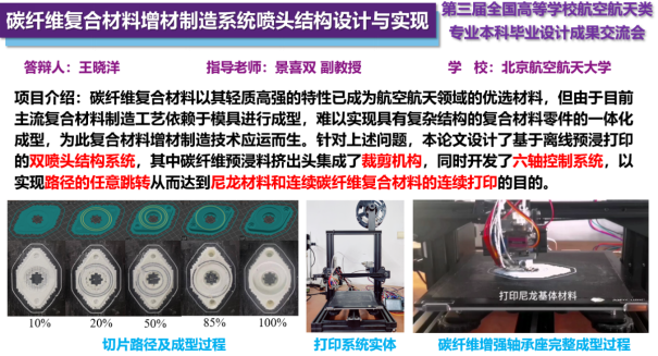 王晓洋同学的毕设成果《碳纤维复合材料增材制造系统喷头结构设计与实现》(指导教师:景喜双副教授)荣获飞行器制造工程专业组一等奖。