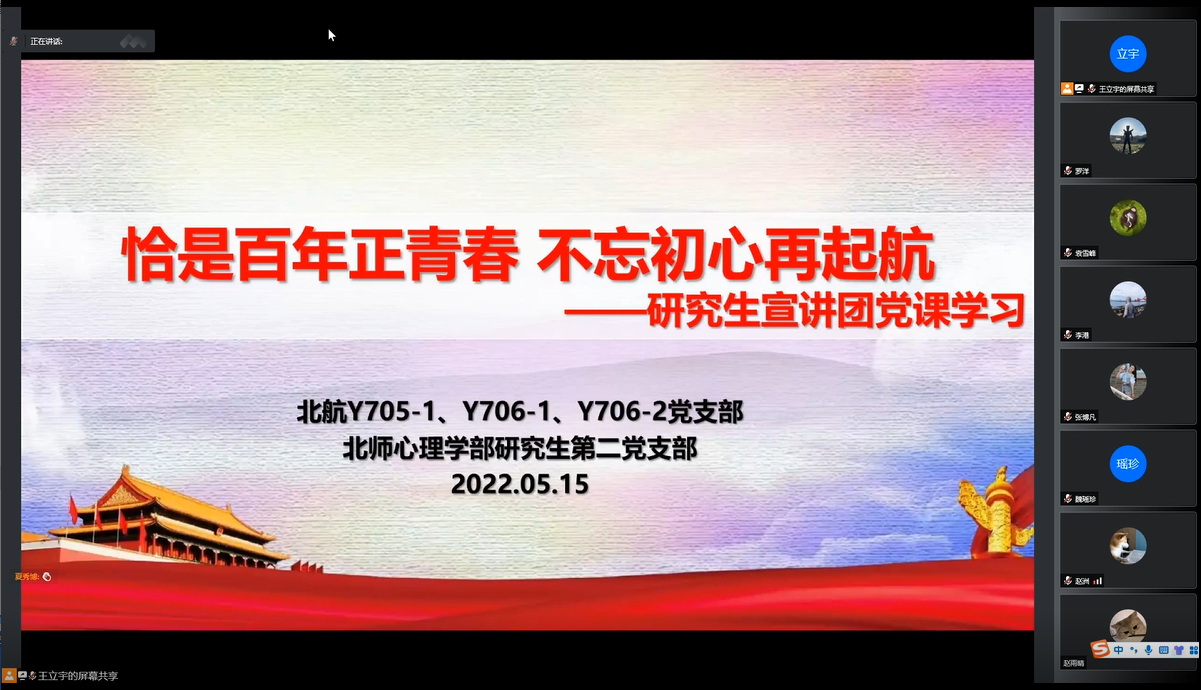 “实现中国梦是一场历史接力赛,当代青年要在实现民族复兴的赛道上奋勇争先。” 回望百年,一代代青年不懈追求的美好梦想,始终与民族复兴的历史进程紧密相联。为进一步学习贯彻习近平总书记在庆祝共青团成立100周年大会的重要讲话精神,深刻理解北京冬奥精神的重要意义,加强党员修养,筑牢信仰之基。2022年5月15日,yl7703永利Y705-1、Y706-1、Y706-2党支部联合北京师范大学心理学部研究生第二支部以及对应团班委开展“恰是百年正青春,不忘初心再启航”线上“学习日”。