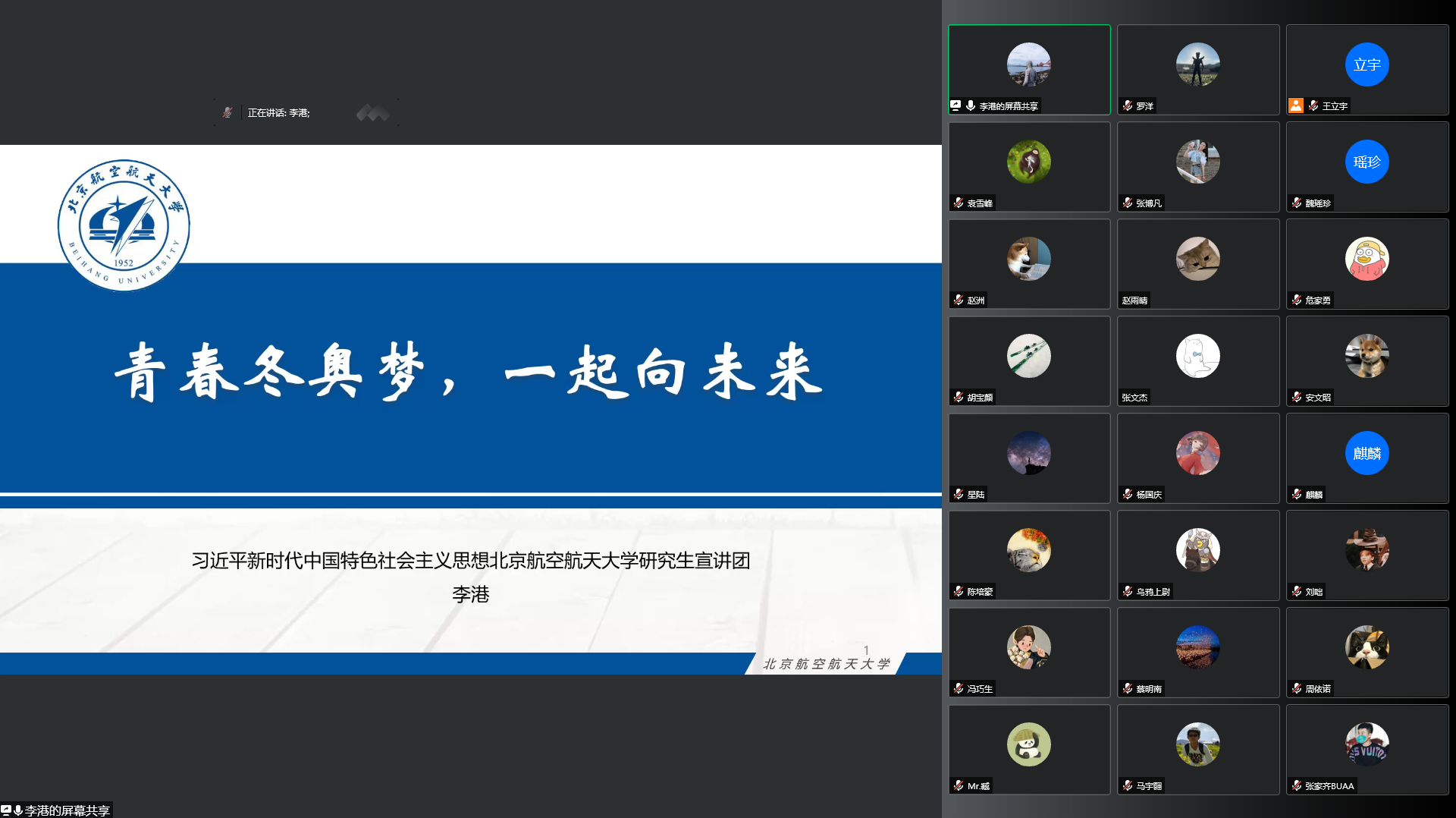 本次学习日邀请到北航研究生宣讲团讲师、北京冬奥会志愿者李港同学与北航研究生宣讲团副团长、初心党建备课组组长张思洋同学,共分为“青春冬奥梦,一起向未来”与“学党员修养,悟初心使命”两个部分。由李港同学分享冬奥故事,讲述亲身经历。“雪花虽小,但千万雪花汇聚可以化作春天的甘霖”,服务于延庆场馆群指挥中心的李港同学,每天都要负责整个场馆的信息传递,他们连续奋战24天,保障了21小项比赛。随着晨光熹微出发,伴着繁星满天而归,这就是对他们志愿生活最好的写照。张思洋同学则带领大家重温《论共产党员的修养》。党员修养无论是对党的建设还是对共产党人来说,都是一个永恒的话题。《论共产党员的修养》作为中国共产党的一篇关于党建的传世之作,是马克思主义中国化进程中的一篇光辉理论文献,为中国共产党的建设和发展做出了巨大的理论贡献和实践价值。
