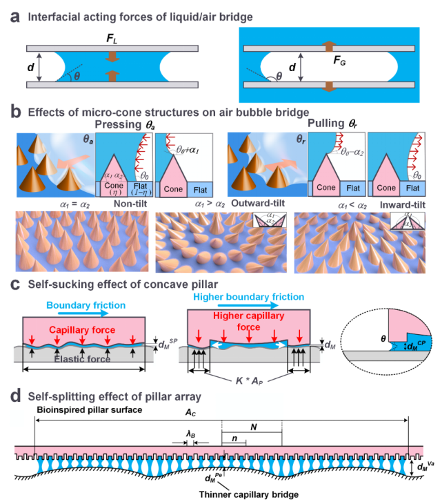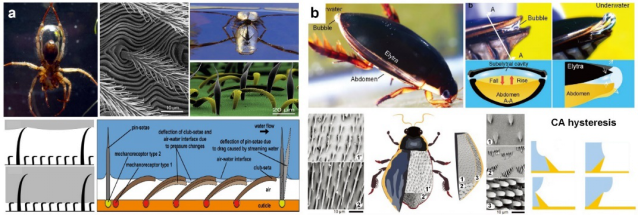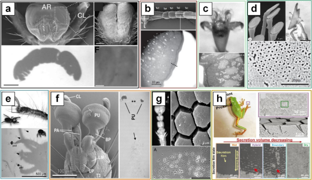 自然界中的生物进化出在湿润环境下产生强粘附的脚垫,如树蛙和蝈蝈。这些脚垫表面末端大部分是密排布的六棱柱平面结构,柱与柱之间的沟槽具有排开界面多余液体作用,柱表面则留有少量液体与固体表面形成毛细力粘附。有趣的是,气泡在水下也能产生较强的粘附作用。一些水生生物在水下依靠气泡来呼吸生存,如水蜘蛛、仰泳蝽和水生甲虫。这些生物依靠表面的多级纤毛能够牢牢粘附住气泡,其粘附力足以抵御来自水流的冲击和浮力。揭示这些潜在生物机制有利于创造更有效的强湿附着表面,并进一步扩大其潜在应用。