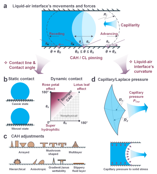 液体具有高表面张力和高流动性的固有特性,在固-液-气相互作用下表现出各种独特的动态行为。产生这些液体行为有两个关键作用,即固-液-气三相接触线的线张力和弯曲液-气界面处的毛细作用(图2)。通常情况下,固-液-气三相的状态受表面结构和材料润湿性质所影响,可以用经典静态接触角模型、动态接触角滞后和接触线钉扎效应来描述,钉扎效果越强烈,接触角的滞后性越大。受自然界生物启发,提取出各种各样的结构如柱状、锥状、蘑菇状等可以直接影响三相接触状态。特别地,蘑菇状多级结构可以产生类似于玫瑰花瓣效应的强钉扎效应,这种结构甚至可以阻止低表面能液体(乙醇)的铺展,形成超疏状态。而各向异性结构和材质则会引起不对称的钉扎效果,可以调控液滴的定向运动行为。液体的另一个关键作用是来自弯曲液-气界面的毛细作用,弯曲界面可以是凸或凹的,作用力方向指向曲率中心,作用力大小可由拉普拉斯压差计算可得。这种弯曲面产生的毛细力不仅可以影响液体前驱界面的运动行为,而且内部产生的负压或正压强可以用于固体表面间的粘附和排斥。理论上对于半径为几百纳米的毛细管内液体可以产生几倍大气压的毛细力。同样地,通过结构和材质的修饰可以调节界面曲率进而实现液体的可控传输和粘附。