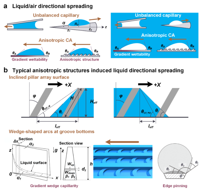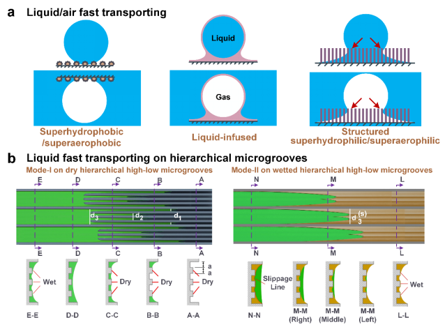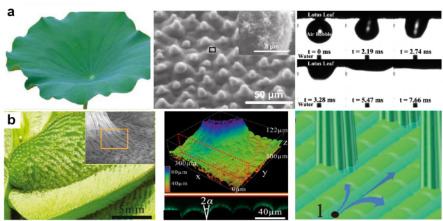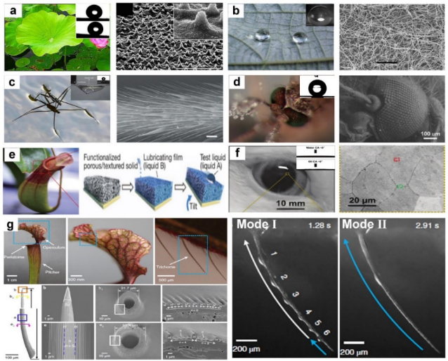 液滴能够在超疏水的荷叶表面快速滚落以达到自我清洁效果。具备类似荷叶效应的生物还有很多,水黾依靠超疏水腿在水面上自由行走,而大部分昆虫的复眼都具有疏水特性以时刻保持清晰视野。相反地,大部分植物如猪笼草、瓶子草为吸收空气中湿气进化出高效润湿集水的亲水性结构,液体在润湿性表面上能够快速铺展。此外,水下的气泡也具有类似的快速传输效应,气体的快速铺展有利于水生/半水生植物在水下的生存。自然界中液体和空气的快速传输对生物的生存至关重要,其表面特征结构和具有独特界面液/气调节机制的低表面能材料有助于构建更高效的生物仿生表面。