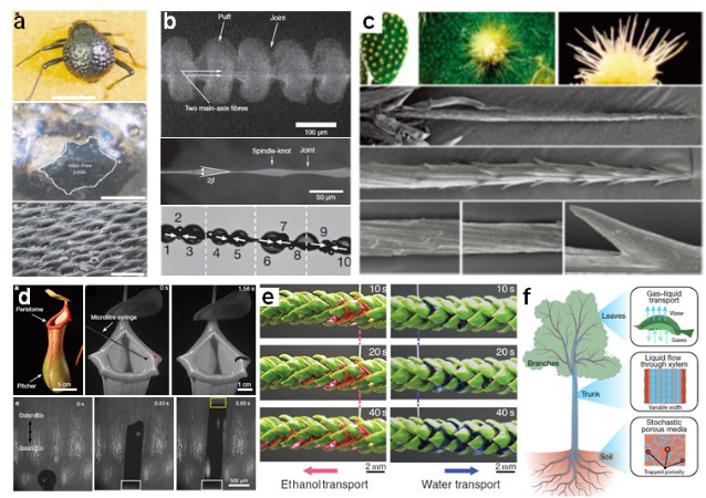 液体定向扩散是一种典型的液体调节方式,各种自然界的生物都配备了这种方式来收集雾气或捕捉昆虫,如沙漠甲虫、蜘蛛丝、仙人掌脊柱、猪笼草口缘和Araucaria叶片,形成了1D、2D和3D不同层级的液体定向输送效应。通过揭示这些复杂的表面结构和材质特性对气、液的定向输送机制,对气、液运动调控具有重要意义。
