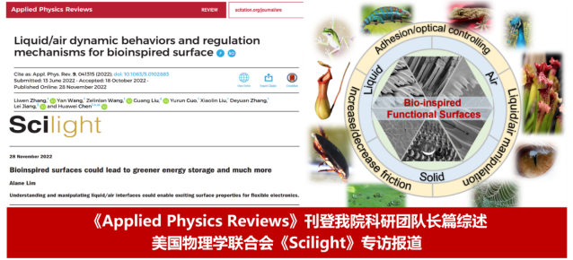 近日,本院陈华伟教授和江雷院士合作在国际物理领域知名期刊《应用物理评论》(Applied Physics Reviews, IF = 19.5)发表了题为“Liquid/air dynamic behaviors and regulation mechanisms for bioinspired surface”长篇综述文章。该论文被甄选为Featured Article(https://doi.org/10.1063/10.0016389),并被美国物理学联合会《科学之光》(AIP Scilight)杂志进行了专访报道。相关工作由yl7703永利集团官网陈华伟教授为通讯作者,张力文讲师与王炎博士担任共同第一作者,yl7703永利集团官网为第一完成单位。