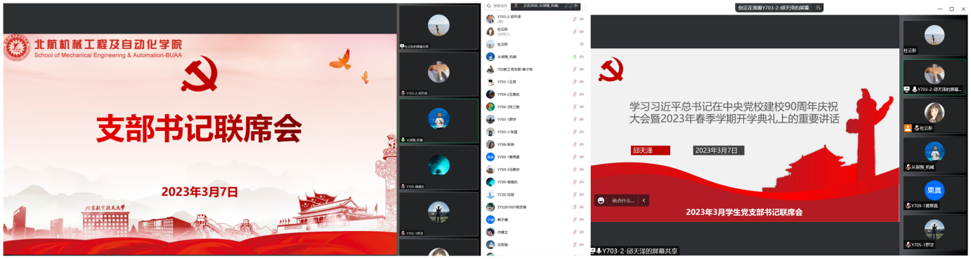 各位支部书记结合自身的工作实际谈了学习体会。Y702支部张贺栋表示,在今后的生活中,要时刻加强理论修养,时刻牢记初心使命。德才兼备、知行合一,为实现第二个百年奋斗目标贡献出自己的绵薄之力;Y704-1支部韩子健表示,作为基层党组织书记,更应该坚守为党育才、为党献策的初心,以身作则,带动支部党员认真研学重要会议精神,紧跟党的路线走,让更多青年党员为党的建设、新时代国家的复兴发展贡献一份自己的力量;Y706-1支部杨鸿鑫表示,深入学习重要讲话精神贯穿支部工作始终,要砥砺不怕苦、能吃苦的精神品格,增强防风险、攻难关、迎挑战能力,不断提高专业化水平,以实际行动践行空天报国。