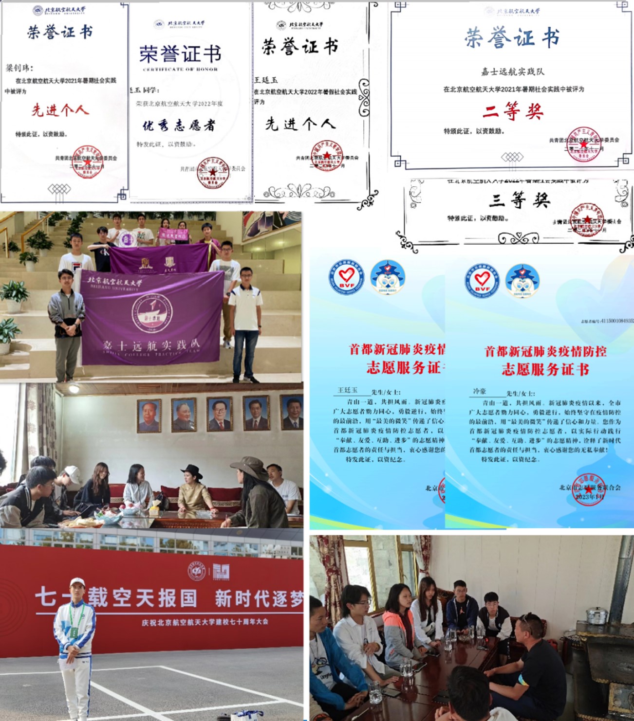 在志愿服务上,他们积极参与,服务社会。志愿时长累计847小时,曾服务过北航七十周年校庆、北京半程马拉松等大型活动,并多次积极献血和参加红十字会救护员的培训工作。