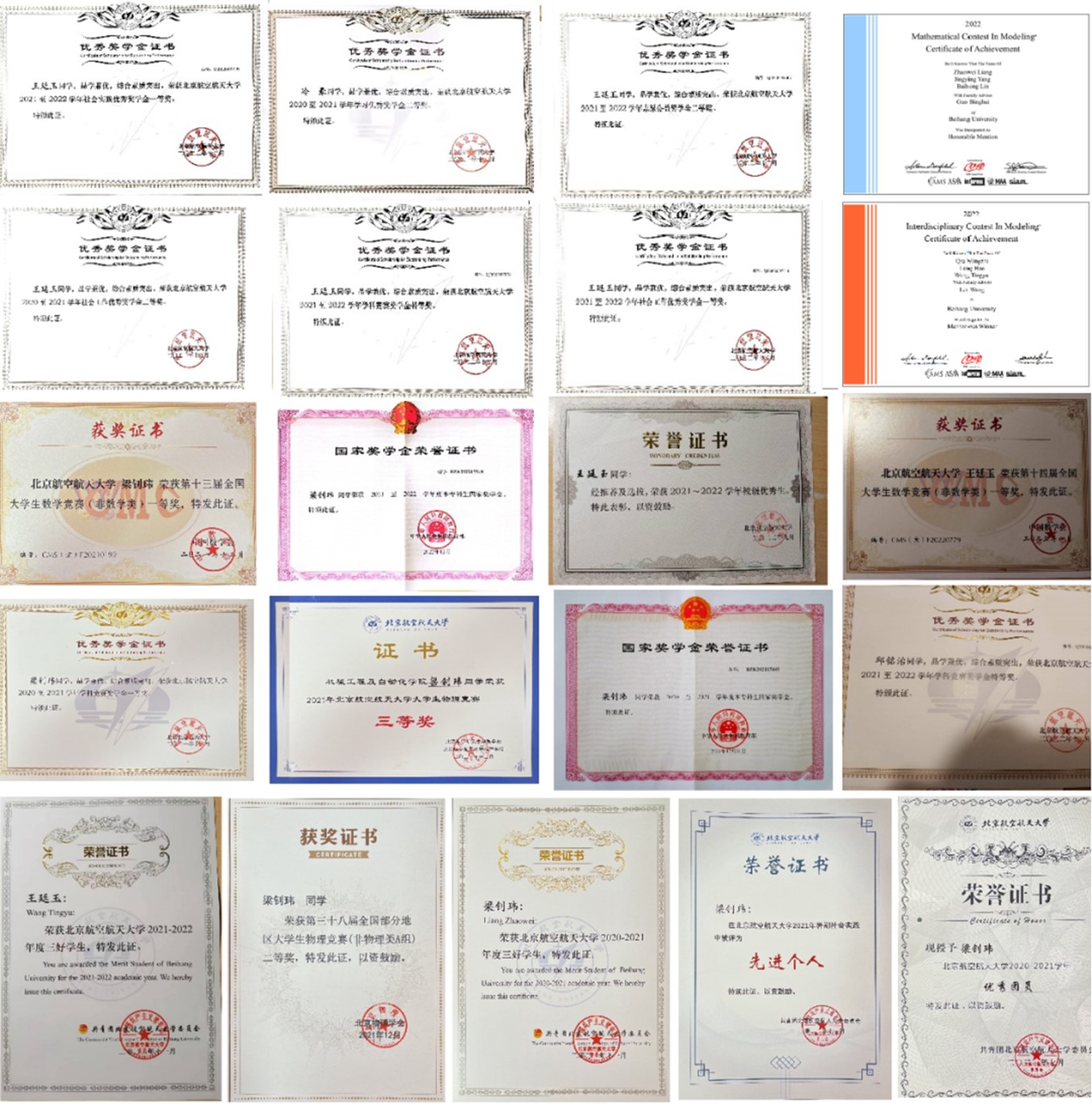 三年多的时间里,四人共获得包括国家奖学金(3人次)、校级特等奖学金(7人次)、中航技奖学金在内的奖学金共28项;获得包括士嘉奖章(院级最高荣誉)、北京市三好员工、优秀生(5人次)、校级三好员工(4人次)在内的荣誉称号共19项。