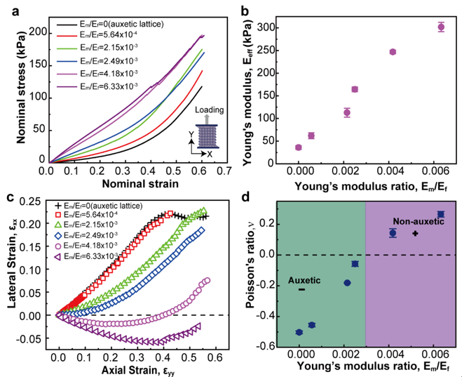 图2:两相拉胀复合超材料通过杨氏模量比调控实现正/负泊松比切换