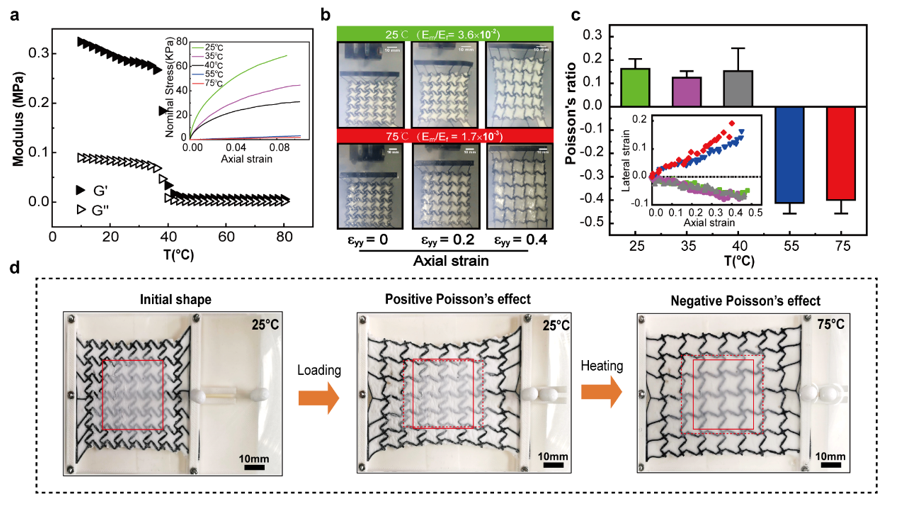 图3:温度响应复合超材料的自驱动正/负泊松比切换行为