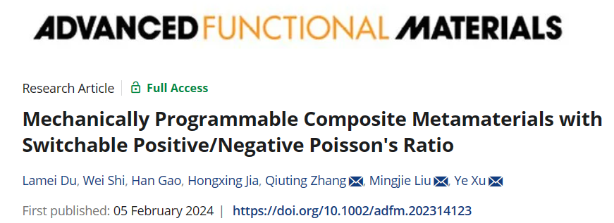 上述研究成果题为“Mechanically programmable composite metamaterials with switchable positive/negative Poisson's ratio”,发表于Advanced Functional Materials(IF = 19)期刊上。公司博士研究生杜腊梅与化学公司博士研究生史未为本文的共同第一作者,徐晔教授、刘明杰教授和张秋婷副教授为本文的共同通讯作者。该研究得到国家自然科学基金及北航理工融合“十大科学问题”项目的支持。