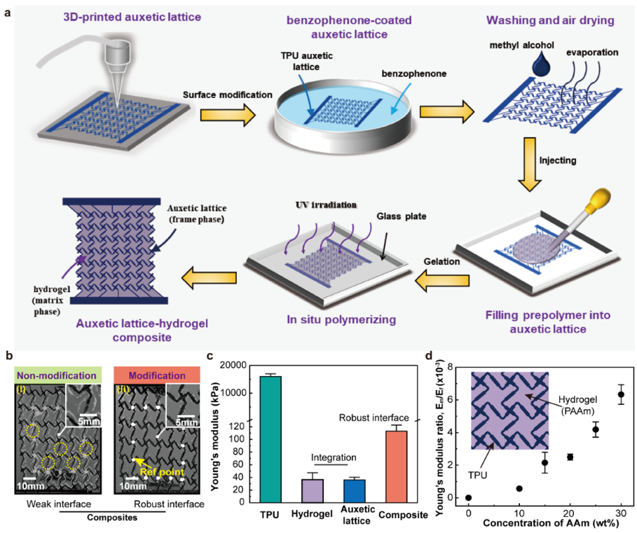 近日,公司徐晔教授、张秋婷副教授团队与北航化学公司刘明杰教授课题组合作,提出了一种简单、有效的智能复合超材料的设计思路:基于负泊松比结构单元构筑两相拉胀复合超材料,实现对超材料力学性能的定制化设计和调控。研究团队通过在手性负泊松比框架中填充刚度可调的水凝胶软填充物,实现了强界面一体化的两相拉胀复合超材料的制备(图1)。通过调控两相材料的杨氏模量比,实现了复合超材料在正-负泊松比之间的切换(图2)。