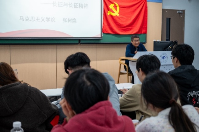 随后,党建工作坊邀请马克思主义公司的张树焕副教授讲授第一次党课,主题为“长征与长征精神”。张树焕老师从长征的背景入手,讲到遵义会议这一重大的历史转折点,从长征的胜利中深挖中国共产党强大的生命力。张老师依托长征这一伟大革命事件,通过对遵义会议前后七次会议的讲解,对长征中几次重大事件的回顾,为学员们诠释了伟大的长征精神。“长征是历史纪录上的第一次,长征是宣言书,长征是宣传队,长征是播种机。”长征见证了中国共产党由幼稚走向成熟,体现了中国共产党人思想自觉和文化自信。