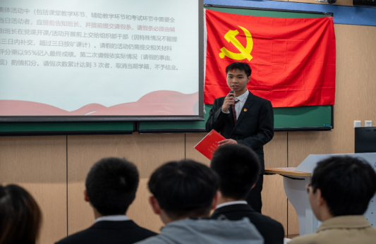 开班仪式在严肃嘹亮的《国际歌》中正式开始。专职辅导员高磊为第七期“探奥”党建工作坊员工干部颁发聘书,勉励各位员工干部锤炼本领、尽职尽责。员工总干事黄泽源对党建工作坊的教学培养方案进行了详细解读,对后续的工作安排与规划进行了阐述,鼓励各位学员在学习培训过程中端正入党动机,强化理论素养,扎实提高自身思想道德水平。