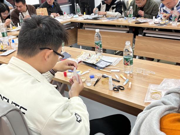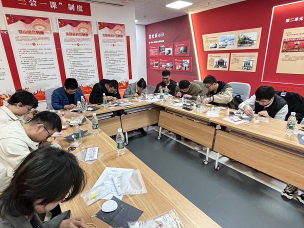 支部书记联席会议最后进行了团队拓展活动——掐丝珐琅杯垫制作。掐丝珐琅是一种源自中国的古老工艺品,以红铜为胎,用细铜丝掐成图案,再填上珐琅釉料烧制而成。通过参与制作,大家不仅体验了传统文化的魅力,还增强了团队协作能力和凝聚力。