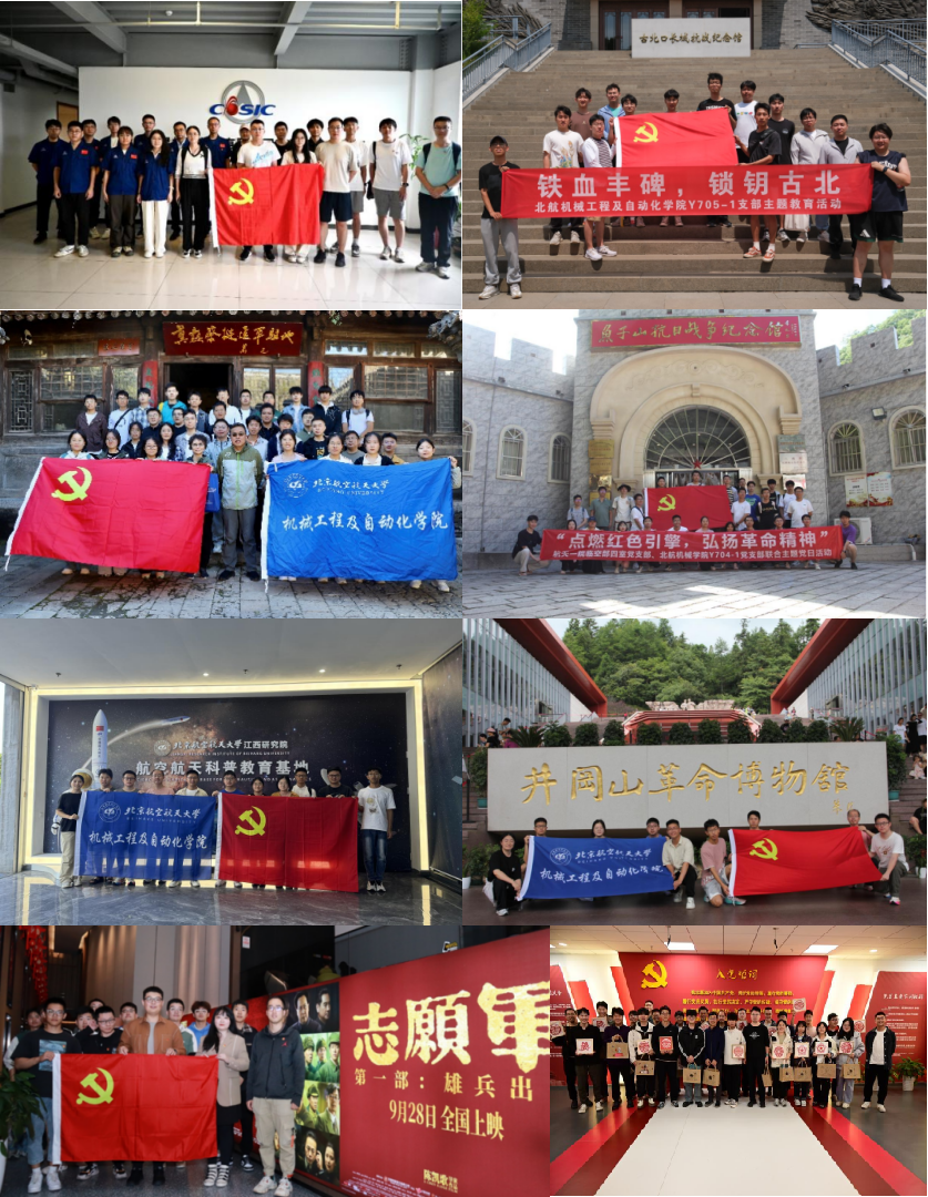 Y702-1党支部组织支部党员参观中国航天科工三院239厂,通过对239厂展厅、焊接技能大师陈久友扎根基层、埋首一线的事迹和特种加工主机厂所的参观感受到航天人攻坚克难、团结协作和无私奉献的精神,同时加深了对自己科研领域的认识,促进了对未来职业选择的思考。Y704-1党支部开展了多元协同的育人强军活动,与航天一院临空部四室党支部共建,组织参观鱼子山革命纪念馆;与北航江西研究公司党支部共建开展南昌八一起义纪念馆参观、井冈山革命根据地烈士陵园和革命博物馆参观学习;邀请教师党员代表孟宝老师开展师生联建活动,组织新老党员交流会、前往中国航空博物馆参观学习和红色元素剪纸和帆布包制作等创作活动来传承红色基因,引领全体党员筑牢思想之基。Y705-1党支部组织党员来到密云区古北口镇参观古北口抗战纪念馆,通过馆内的历史资料和抗战遗物,切身实际地感受到密云长城沿线的抗战事迹,感受到广大爱国将士,抱誓死卫国之决心。Y705-2党支部组织党员前往冀热察挺进军司令部纪念馆,通过对八路军冀热察挺进军司令部旧址和抗日战争时期的华北军区北岳第三军分区司令部旧址的参观,一起跟随抗战英雄的脚步,感受到萧克将军带领马栏村人民英勇奋战的光辉历史,在党史学习教育中不断坚定信念。Y706-2党支部组织党员共同观看了《志愿军:存亡之战》,感受到抗美援朝伟大精神,致敬不畏牺牲的志愿军烈士和中国人民不畏强暴的钢铁意志,深刻理解了抗美援朝战争的伟大胜利对中国和世界重大而深远的意义。