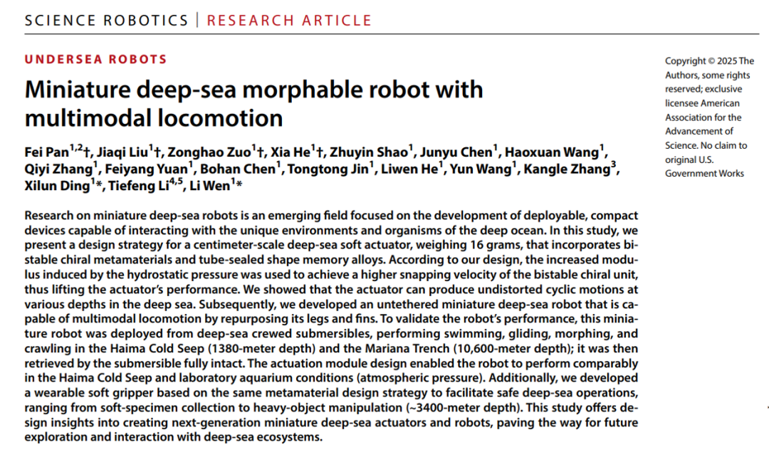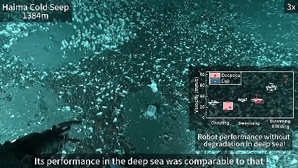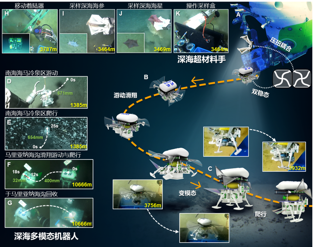 为了验证机器人的性能,研究团队在多个深海地点进行了实地测试。在几年的测试时间中,机器人搭载“深海勇士号”和“奋斗者号”载人深潜器完成了包含海马冷泉(1384m)、龙西海山(3756m)和马里亚纳海沟(10666m)在内的多地形、全海深的共计14次部署测试。在3756m深海下,驱动器的驱动性能超越了实验室的性能,在摆动幅度上得到了24.9%的提升。在1384m深海的游动(33.7 mm/s)、滑翔(72.1 mm/s)、爬行(21.5 mm/s)的多模态运动速度与常温常压下(游动33.1 mm/s、滑翔56.9 mm/s、爬行21.5 mm/s)的表现相当。深海低温高压下机器人的运动性能可以媲美甚至超越实验室常温常压下的运动性能,并成功实现了预期的多模态运动。