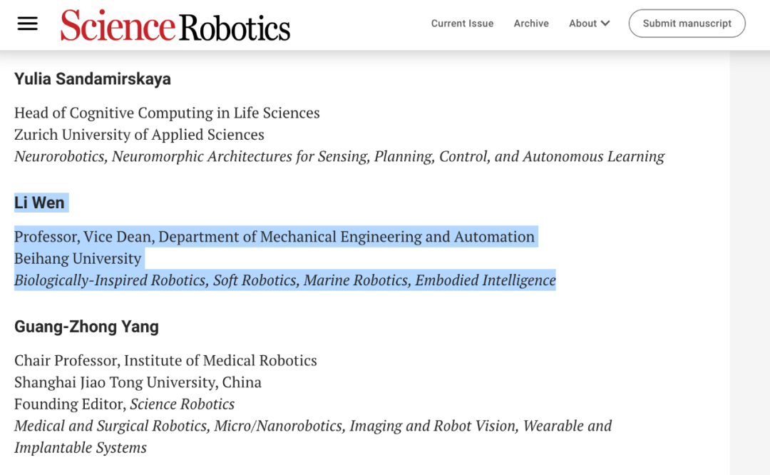 日前,文力教授凭其在仿生机器人、软体机器人及海洋机器人等领域的学术贡献,荣膺Science Robotics期刊新一届编辑与咨询委员会(Editorial and Advisory Boards)委员(全球共25名科学家入选)。