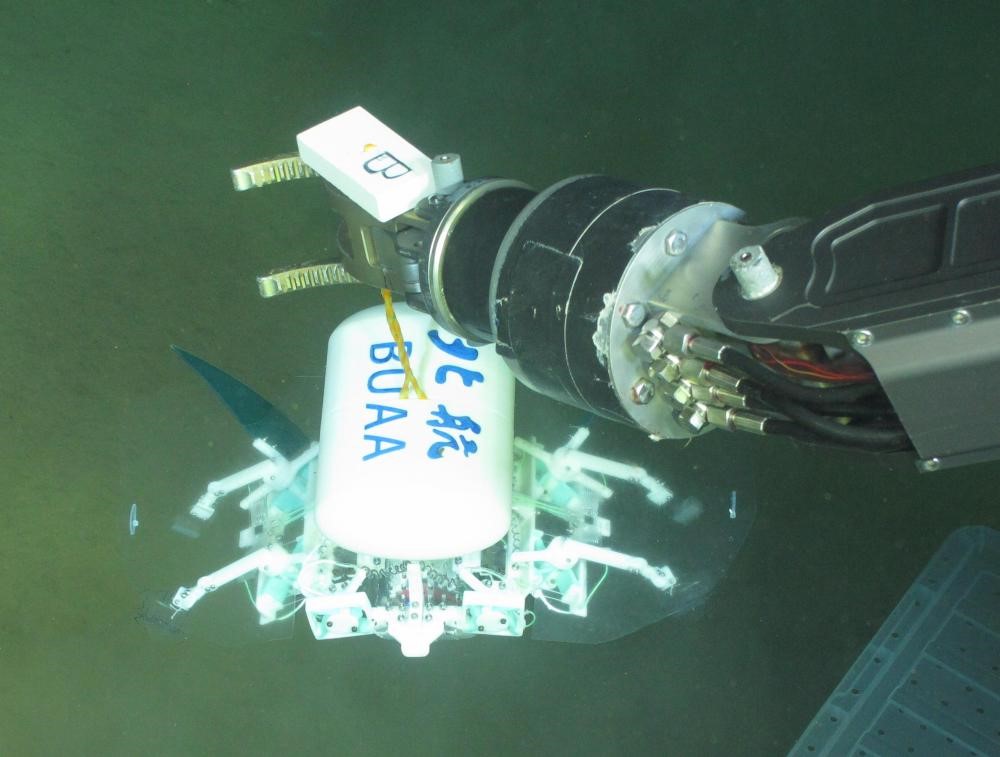 北航深海小型机器人在海里游动、爬行。(受访者供图)