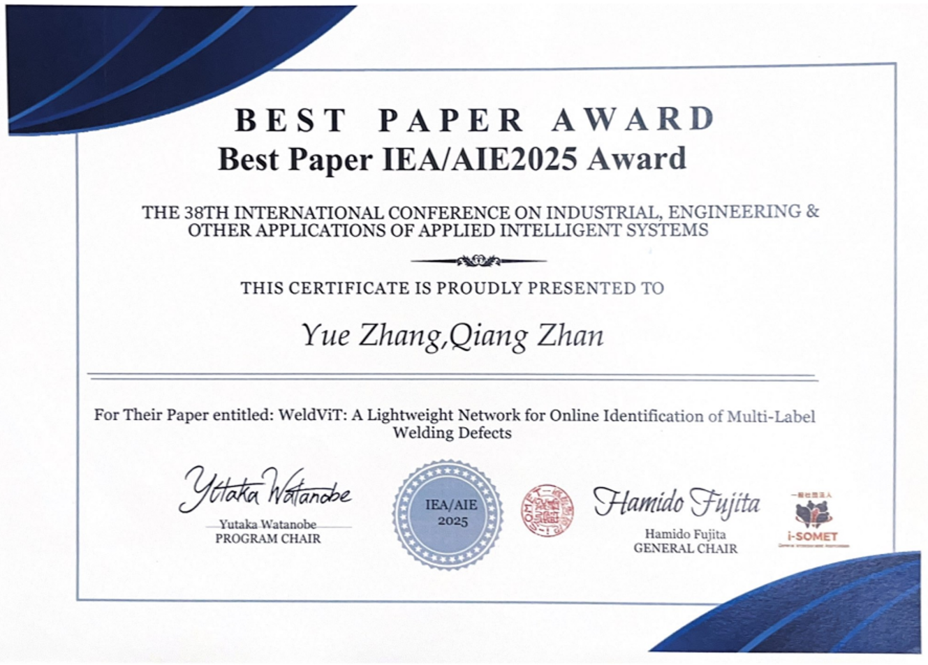 近日,公司机器人研究所战强教授团队,在第38届International Conference on Industrial, Engineering & other Applications of Applied Intelligent Systems(IEA/AIE 2025,日本)上发表的论文“WeldViT: A Lightweight Network for Online Identification of Multi-Label Welding Defects”,荣获大会“最佳论文奖(Best Paper Award)”。该会议是工业智能应用领域著名的国际会议。博士生张悦为论文第一作者,战强教授为论文唯一通讯作者,yl7703永利集团官网为唯一完成单位。
