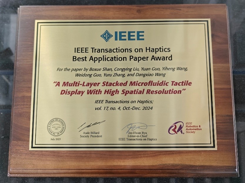 IEEE Transactions on Haptics(简称 ToH)是触觉与力反馈领域最具影响力的国际期刊之一,隶属于 IEEE(Institute of Electrical and Electronics Engineers,美国电气与电子工程师协会)旗下核心期刊。ToH 每年出版四期,每期约收录 8–12 篇 高质量论文,内容涵盖触觉感知、力反馈接口、触觉建模、感测与显示技术等多个方向。自 2017 年 起,ToH 每年评选一篇“最佳应用论文”(IEEE Transactions on Haptics Best Application Paper Award),以表彰在实际应用中具有显著影响力的高水平研究。这是该奖项首次授予由中国学者主导的研究成果,标志着中国学者在国际触觉研究应用领域的重要突破与广泛认可。