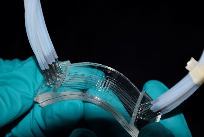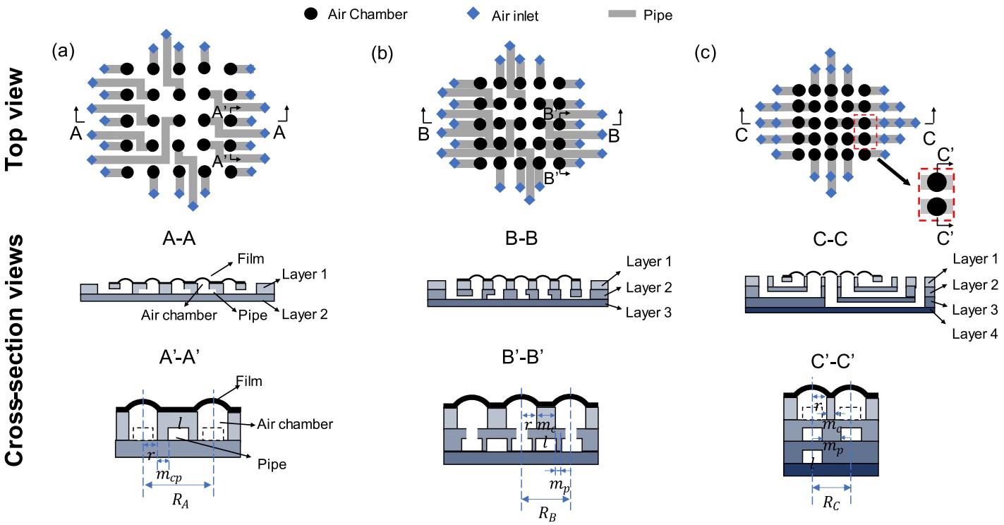 触觉是人类最基本的感官之一,它使我们能够感知并体验周围的世界。通过触摸物体表面的三维拓扑形貌,人们可以完成如阅读盲文、感知布料纹理、欣赏雕塑等一系列触觉交互任务。气动触觉显示器通过重构装置表面的微观形貌,模拟真实世界的纹理特征,从而为用户提供丰富的触觉体验。现有触觉显示装置面临诸多瓶颈:在狭小空间(指尖)内高密度集成气动致动器对流体网络布线提出巨大挑战,限制了触觉显示空间分辨率的进一步提升;传统触觉显示装置的刚性结构无法与弯曲表面共形集成,限制了触觉显示技术的推广和应用。