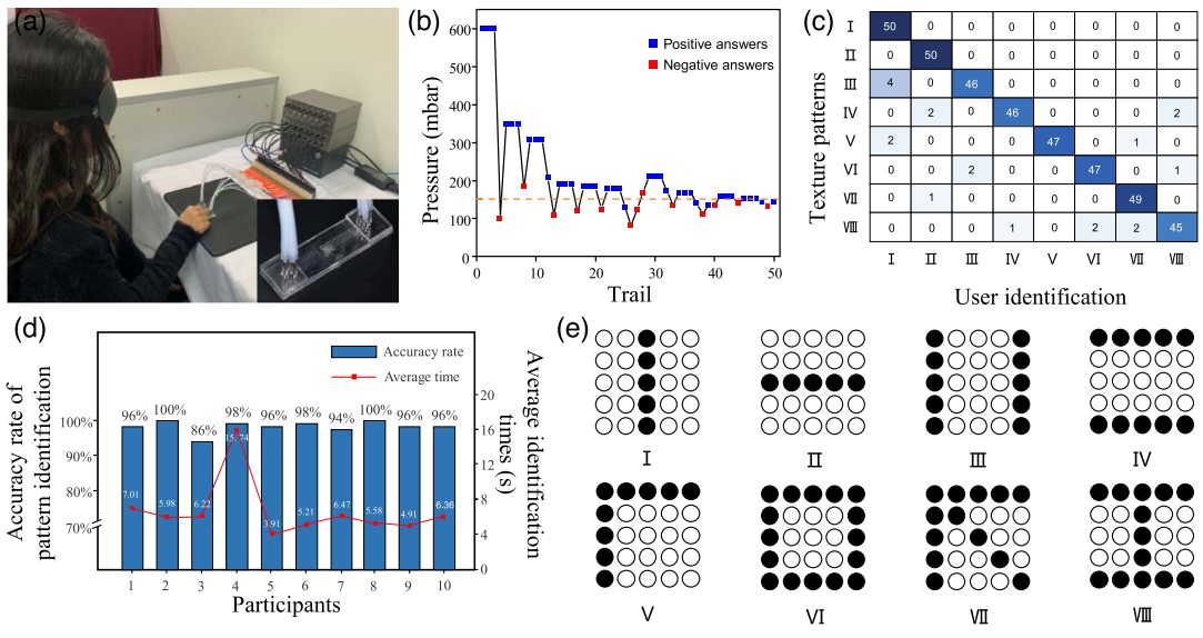 研究团队在不同输入压力条件下对微流体触觉驱动器进行了系统性能评估,结果表明该触觉显示器能够在稳定变形、高重复性和快速响应等方面实现鲁棒的触觉反馈性能,满足复杂触觉纹理重建和动态交互需求。最后,研究团队通过一系列主观实验验证了该触觉装置在模拟纹理图案方面的有效性。实验设计包含8种典型触觉模式,通过5×5驱动器阵列(空间分辨率为1.25 mm)在100 kPa气压下动态生成,受试者可以轻松分辨出八种触觉图案,准确率高达 96%,充分证明了该装置在高分辨率触觉图案呈现中的可行性与实用价值。