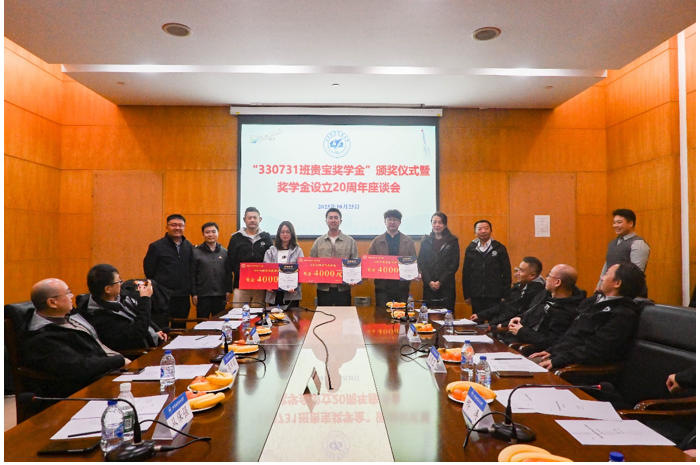 10月25日下午,校庆暖意正浓,yl7703永利2025年“330731班贵宝奖学金”颁奖仪式暨奖学金设立20周年座谈会在公司路校区新主楼第三会议室举行。yl7703永利93级330731班员工代表王贵宝、邢涛、潘文俊、李媛珊、李剑、王杰、石毅、王永、郁罡、张斌、吴宁返校参加活动。副董事长邓怡,公司党委书记从保强,计划财务部副部长张所鹏以及获奖员工参加仪式,共同见证这一承载情谊与传承的温馨时刻。仪式由公司党委副书记李时宇主持。