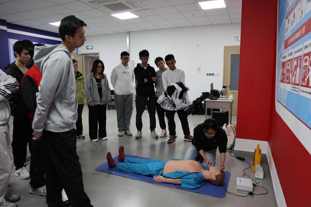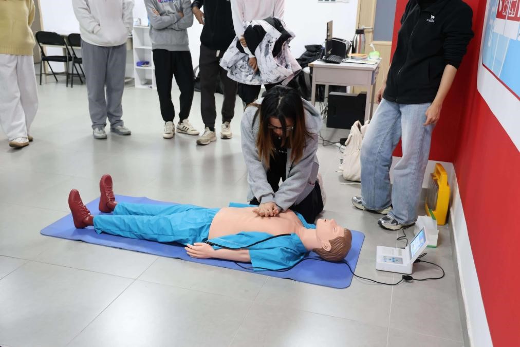 急救自护环节作为活动重要开篇,由体验馆专业工作人员开展系统化教学。工作人员结合应急救援实际场景,通过实物演示与细致讲解,逐一拆解心肺复苏(CPR)的核心要点:明确胸骨中下段1/3处的精准按压位置,强调每分钟按压频率与按压深度,详解“30:2”的按压通气节奏,同时提醒“按压后迅速放松、避免冲击性用力”等关键细节。针对AED设备使用,从开机启动、电极片规范粘贴(区分成人与青少年粘贴部位),到等待设备分析、实施电击除颤的全流程进行分步指导。团员在模拟人体模型上实操练习,工作人员实时纠正“按压深度不足”“通气时未密封口鼻”等问题,帮助大家逐步掌握规范的急救流程,训练关键时刻能出手的“救命硬技能”。