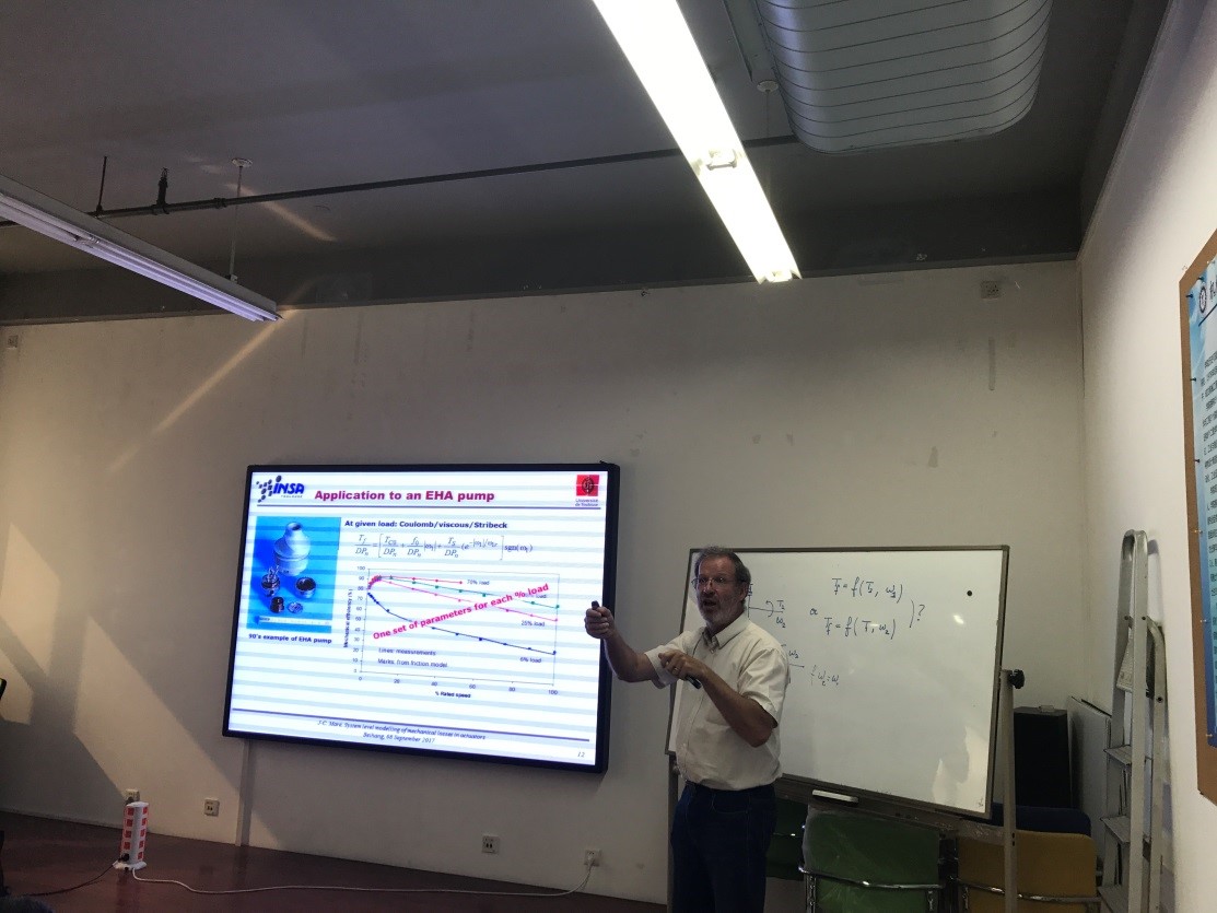 第一场报告中,MARE教授首先介绍了针对航空作动器组件进行机械(摩擦等)损耗建模的必要性,既能降低设计开发的时间和成本,同时也更加符合环境友好型产品的发展趋势。他结合自己多年来航空科研经验,通过理论与仿真相结合的形式,详尽的介绍了摩擦效应在作动器核心组件如EHA泵、减速器、EMA丝杠等的应用研究。报告后,流体中心的老师和同学们,以及33所的专家针对自己在研究过程中遇到的疑难点同Mare教授进行交流。