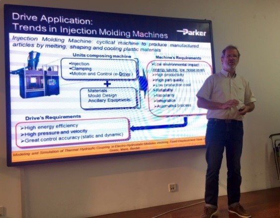 第二场报告是基于MARE教授与美国Parker公司合作的研究成果,该研究的是对象是一款应用于新型注塑机的研制。MARE教授从注塑机的驱动器、机械部分出发,逐步细化,同时针对液压伺服模块(包括泵、壳体、电机)的热液压模型进行了讲解,阐述了热建模仿真技术的在机电一体化产品研制中的重要意义。