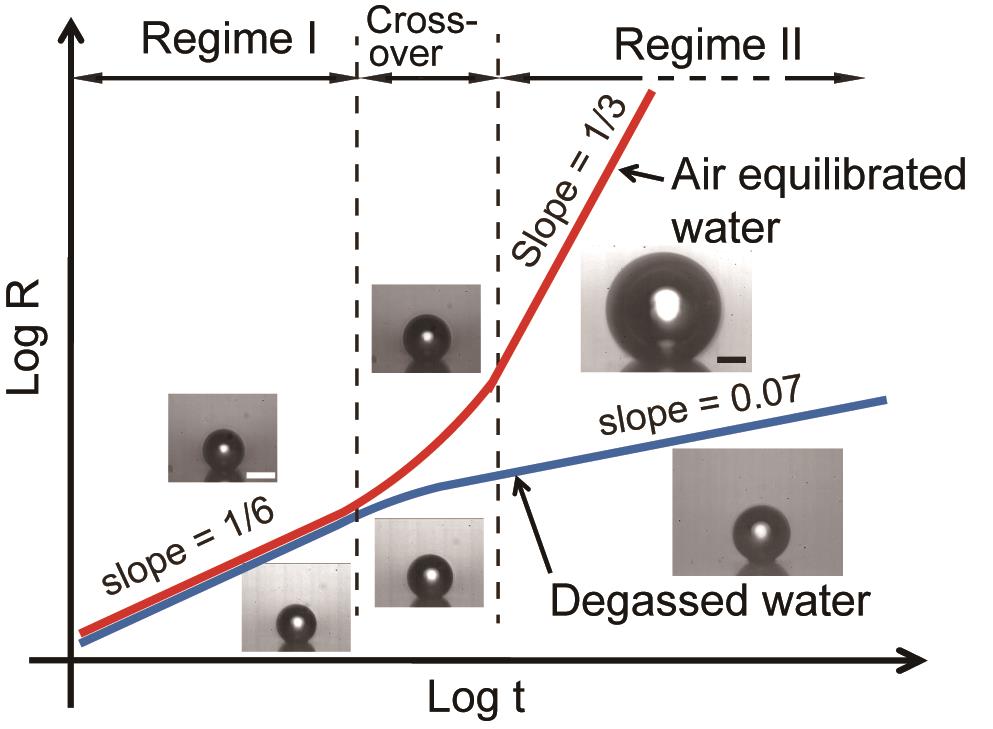 金、银、铂等贵金属纳米颗粒在激光照射下存在离子体效应,能够迅速的将光能转化为热能。在液下环境中,转化得到的热能迅速把水气化,生成微米级气泡,称之为等离子气泡。等离子气泡在太阳能利用、微纳操作、医学影像增强、以及癌症诊断等方面有巨大的应用潜力,成为了近年来微纳领域的研究热点方向。一直以来,研究人员普遍认为等离子气泡主要由水蒸气组成。北航yl7703永利王玉亮副教授联合荷兰特温特大学以及澳大利亚皇家墨尔本大学的科研人员,利用超高速摄像机,通过观测等离子气泡产生的动态过程,在国际上首次揭示了等离子体气泡的产生机理。他们的研究表明,等离子气泡只有在产生后的大约10 ms左右主要由水汽组成(下图,Regime I)。而后,水中溶解的空气逐渐通过液气界面扩散,进入气泡中,进而在随后的气泡生长环节中起主要作用。这一研究结果,对其他等离子体气泡相关应用具有重要的指导意义,也为课题组下一步基于等离子体的应用研究奠定基础。