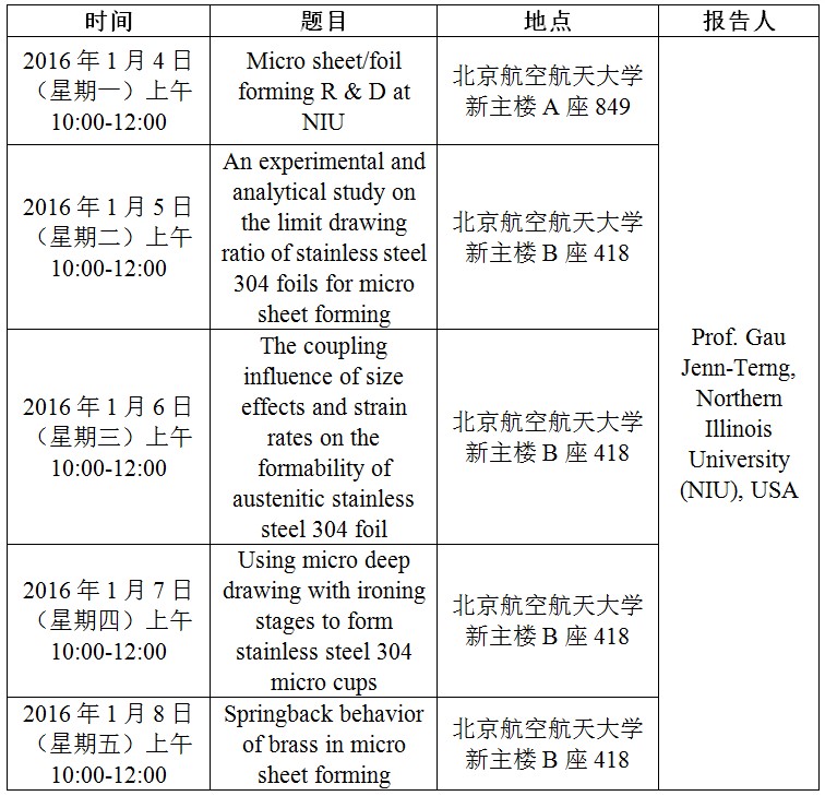 应飞行器制造工程系万敏教授邀请,Northern Illinois University(北伊利诺伊大学)的Gau Jenn-Terng教授将于2016年1月4日—9日开展为期5天的系列学术讲座,介绍金属微成形技术,欢迎大家参加。