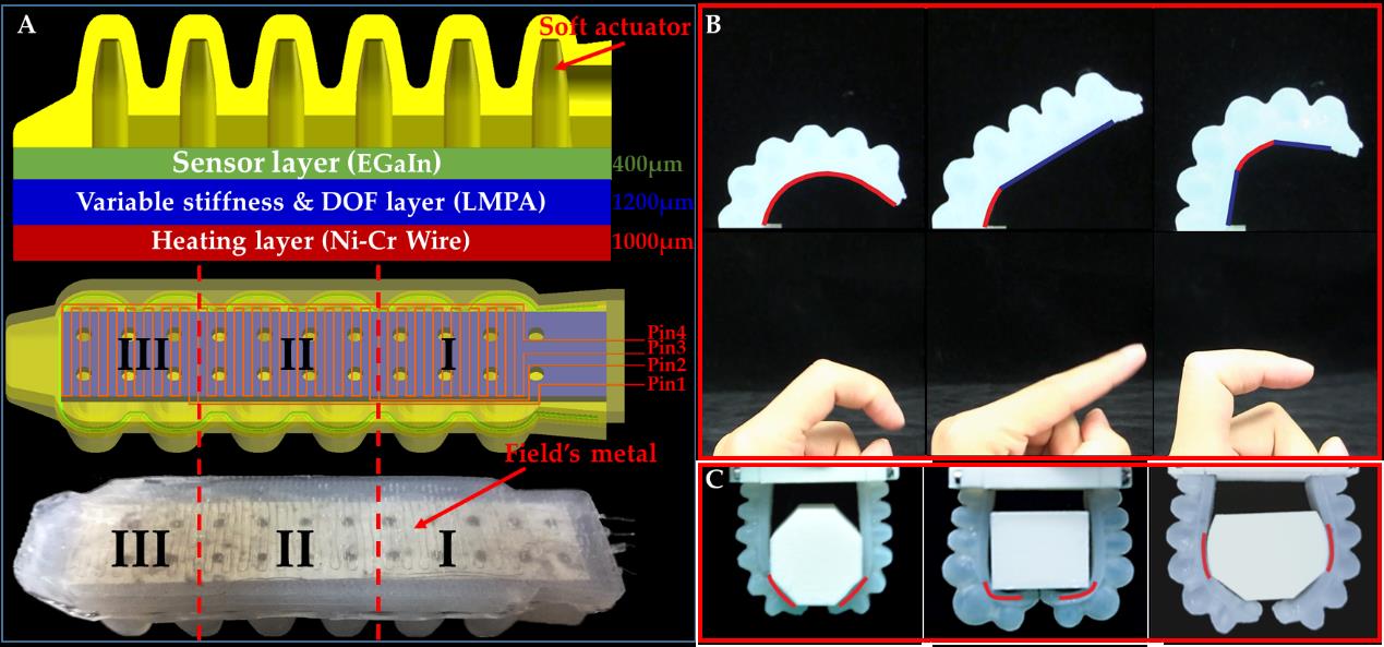 该研究将软体机器人和液态金属相结合,利用液态金属首次实现变刚度、变自由度与柔性传感与气动软体驱动人工肌肉的一体化。研究中提出将变刚度层、串联加热层利用3D打印+铸模方式嵌入到软体驱动器底层,调控加热层从而控制液态金属的相变,进而同时达到变刚度、变自由度。此外,通过液态合金微腔道获取驱动器的形变与曲率信息。基于液态合金的软体机器人不仅可以调节驱动器刚度,还扩展了软体机器人的运动模态。该研究为软体机器人未来的发展提供了新的思路。