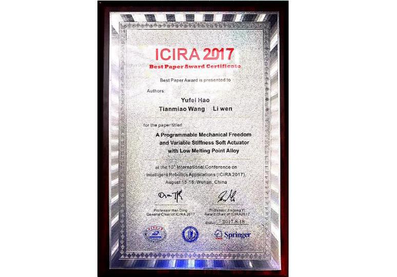 2017年第十届智能机器人与应用国际会议(The 10th International Conference on Intelligent Robotics and Applications)与8月15-18日在武汉召开。本次会议中公司iTR中心软体机器人实验室投稿的题为《A Programmable Mechanical Freedom and Variable Stiffness Soft Actuator with Low Melting Point Alloy》的论文获得大会最佳论文奖(Best Paper Award)。本届会议由国家自然科学基金委员会和华中科技大学联合主办,围绕软体与仿生机器人、水下机器人、虚拟现实与人工智能等14个专业方向,开展了48个分论坛,大会共发表论文355篇。
