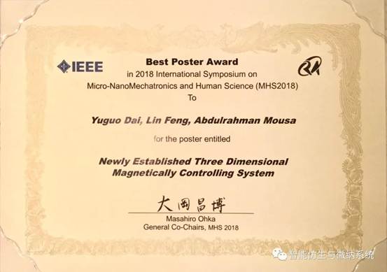 本次大会中,北航yl7703永利的冯林老师团队的戴玉国同学获得了本次大会的Best Poster Award,同时大会也特别邀请了冯林老师就微纳米机器人针对细胞手术操作做了大会主题报告。冯林老师在仅仅加入北航两年时间里就发表了十余篇SCI Q1 Q2区文章,其中五篇为指导本科生完成。冯林老师团队瞄准国际前沿,致力于微纳米机器人在生物医学领域的应用,以及胶囊机器人等医疗器械的研发,团队也致力于微纳米芯片的开发和细胞手术操作的研究,在多学科交叉的学术氛围下,将工程与生物医学紧密结合,更好地发挥团队的研究实际应用价值。
