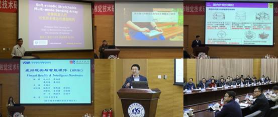 第二个环节的触觉技术研讨会由吉林大学通信工程公司经理孙晓颖教授主持。徐卫良教授(新西兰奥克兰大学)、徐迎庆教授(清华大学)、和宋爱国教授(东南大学)分别就软体机器人可变形多模态触觉传感器阵列、面向盲人的触觉认知与交互体验设计研究、力觉测量及空间站灵巧操作人机工效评估进行了介绍,引发参会师生热烈讨论。