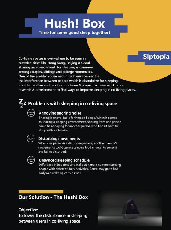 Slptopia团队从老员工宿舍生活的睡眠干扰现象的痛点出发,针对高密度人口城市中共享睡眠空间的人群(例如:住宿员工、换班职工)设计了一款名为Hush Box的智能情感化交互装置,旨在解决因不同作息时间、走动、声音而造成的睡眠干扰问题。产品以多面体呼吸灯的形式呈现,在不同面体上分布不同功能触发装置。主要功能为:主动降噪控制、通过APP及灯光变化提醒噪音来源方、睡眠检测和白噪音唤醒。在最终样机中,通过借助ANC等相关技术,产品可以在有限范围内实现噪音减小效果。